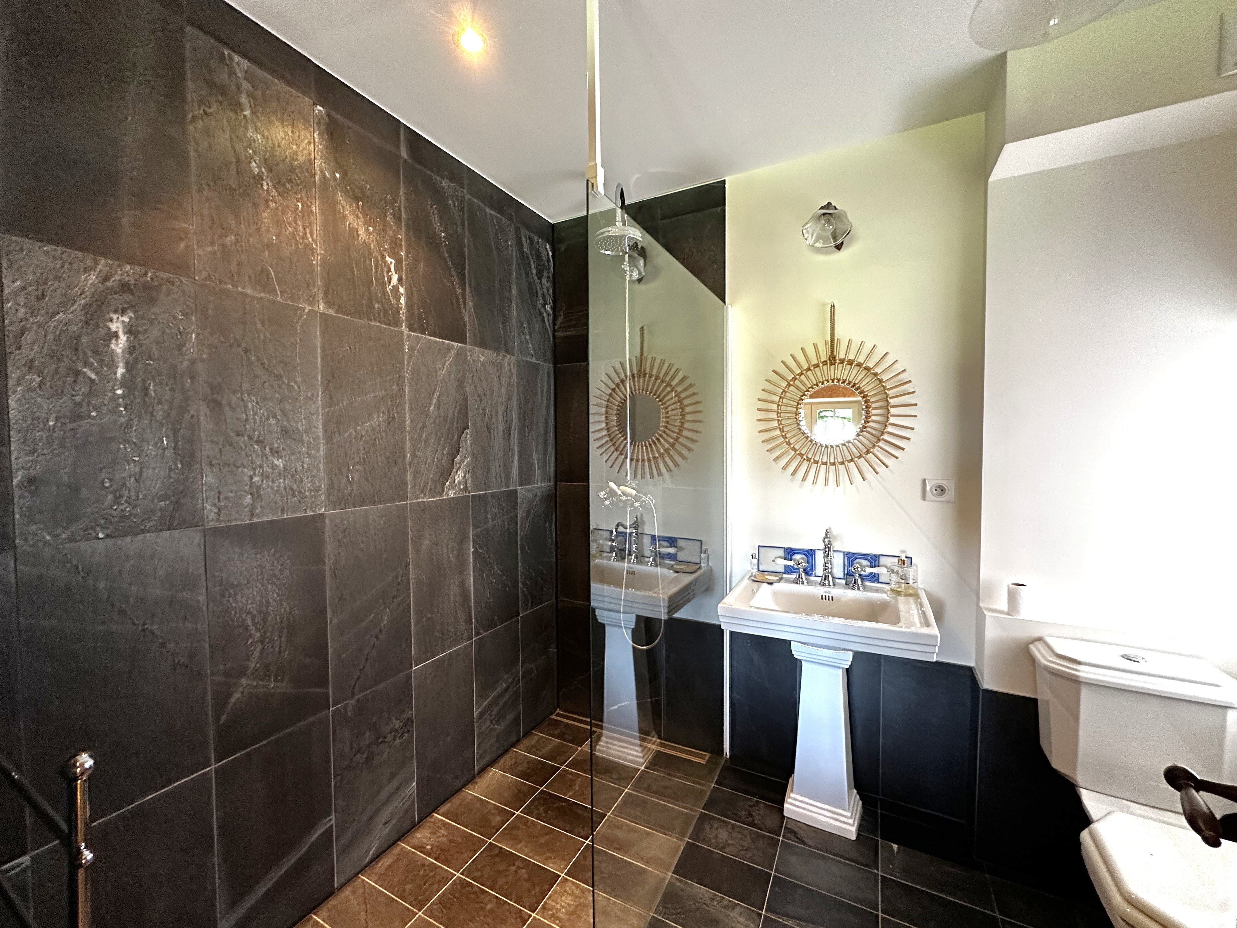 Cette maison en pierre magnifiquement rénovée, comprenant 5 chambres, offre un fabuleux espace de vie/réception au premier étage permettant de profiter pleinement de la vue panoramique environnante. Accessible par un portail télécommandé, elle est située en hauteur, au milieu d'un terrain de 4 hectares, dans un cadre champêtre magnifique, calme et tranquille. Elle comprend également une charmante maison d'amis indépendante de 2 chambres et une piscine à débordement. Le chauffage de la maison principale est géothermique. Surface habitable : 471 m².